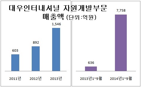 대우인터내셔널은 2011년까지만 해도 자원개발부문 매출이 603억 원에 불과했지만 2012년 892억 원, 2013년 1천546억 원으로 계속 증가했다.