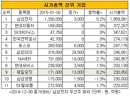 제일모직도 올 들어 8.2%(1만3천 원) 상승하면서 지난 2일 17만1천 원에 장을 마감하며 시가총액 9위에 올랐다. 이 회사는 2일 개장 초부터 강세를 보이면서 장중 17만4천원으로 사상최고가를 기록하기도 했다.