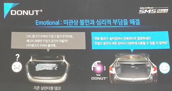 기존 LPG차량은 부피가 큰 원통형 연료 탱크가 트렁크 공간에 적재돼있어 좁은 적재공간과 안전에 대한 불안감을 유발해 미관을 해치는 단점이 있었는데 신형 LPG 탱크는 기존 하단 스페어타이어 공간에 도넛 형태의 탱크가 탑재돼 최대한 넓은 공간을 확보할 수 있는 것이 장점이다.