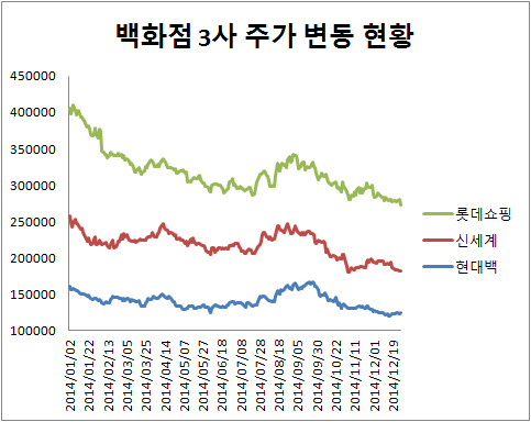 이 때문에 백화점 3사 주가도 1년 사이 평균 30% 가까이 떨어지는 등 하향세를 탔다. 지난해 1월 초 40만6천 원에 육박하던 롯데쇼핑은 연말 27만3천 원을 32.8% 떨어졌으며 신세계가 25만7천500원에서 18만1천 원으로 29.7% 떨어졌다. 가장 하락폭이 적은 현대백화점도 16만500원에서 12만3천 원으로 23.4% 떨어졌다.