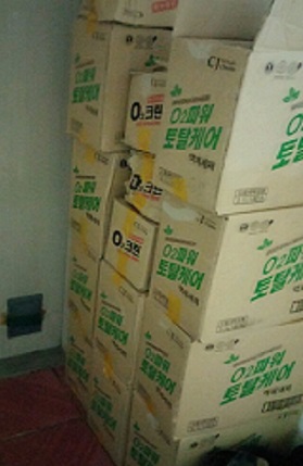 하지만 지난해 TV에서 '대기업 짝퉁 세제'를 방송했던 내용이 떠올라 제품을 자세히 확인해보니 역시나 진짜가 아니었다. 복도에 쌓여있는 세제 박스에는 크게 CJ라고 적혀 있고 옆에 cham이라는 작은 글씨로 적혀 있었다.