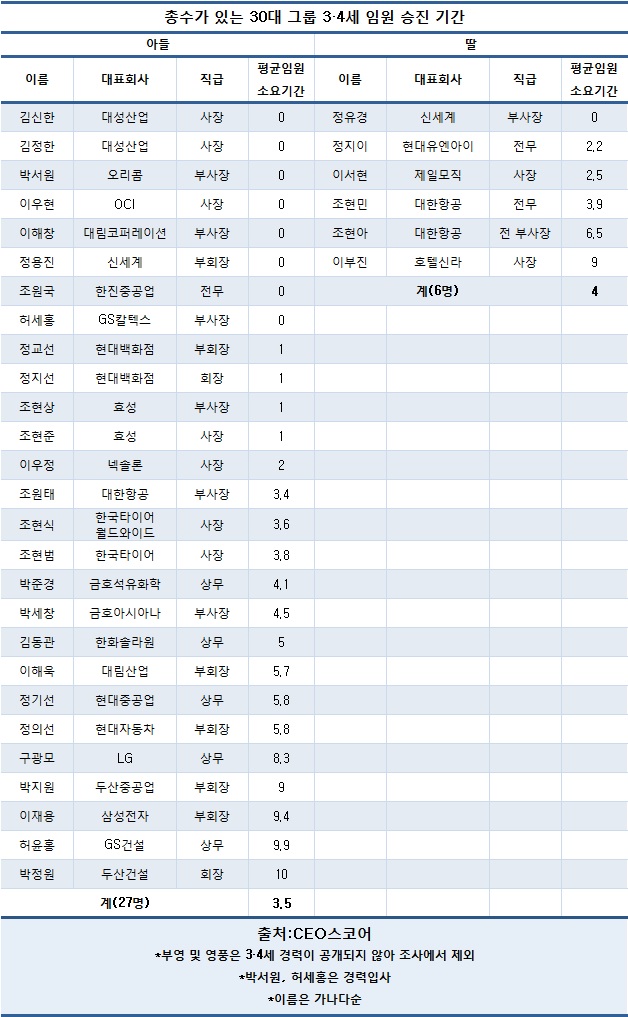 조양호 한진 회장의 장남인 조원태 대한항공 부사장은 3.4년으로 3·4세 평균보다 빠르게 임원이 됐다.