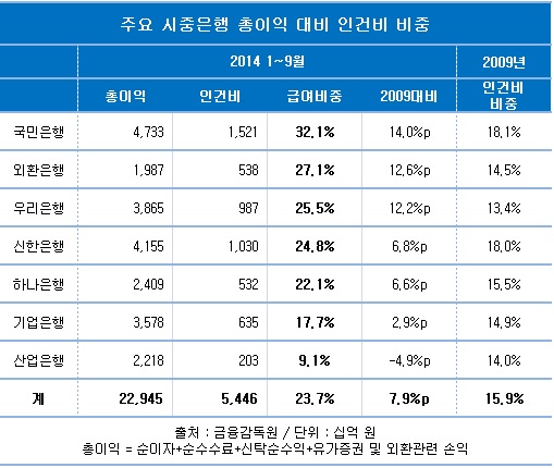 7대 시중은행 가운에 인건비 비중이 가장 높은 곳은 국민은행으로 총이익의 32.1%가 직원 급여로 사용됐다. 4조7천300억 원을 벌어 1조5천200억 원을 인건비로 사용했다.