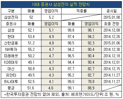 삼성전자(대표 권오현)가 지난해 잠정실적을 8일 발표한 결과를 기준으로 비교해보면 국내 10대 증권사의 실적 추정치가 실제 매출과 영업이익을 전부 밑돌았다.