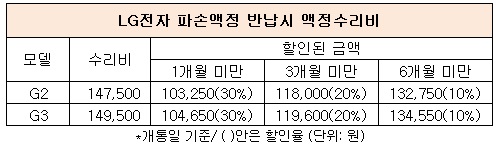LG전자 역시 파손액정을 반납하는 조건으로 사용기간에 따라 액정수리비 할인율을 차등 적용하고 있다. 지난해 5월 출시된 G3의 경우 개통 후 30일(한 달) 이내에 액정교체시 30% 할인해주고, 90일(3개월) 미만은 20%, 180일(6개월) 미만은 10% 할인해준다.