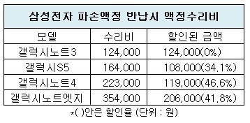 갤럭시S5는 액정수리비가 16만4천 원인데 파손액정을 반납할 경우 10만9천 원으로 33.5% 할인된다. 수리비가 1만 원 가량 비싼 갤럭시S5 광대역 제품도 17만1천 원에서 11만4천 원으로 30% 이상 저렴해진다. 갤럭시노트4는 전략 스마트폰답게 수리비용이 22만3천 원에서 11만9천 원으로 47%나 할인된다.