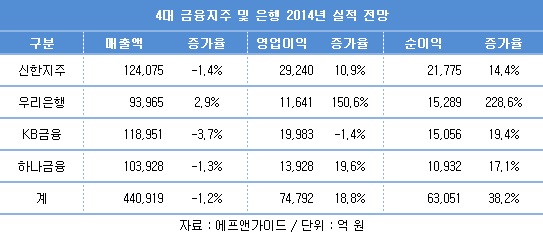 14일 금융정보업체 에프앤가이드에 따르면 4대 금융지주의 지난해 추정 매출액은 44조900억 원으로 2013년 44조6천100억 원보다 1.2% 감소한 것으로 분석됐다.