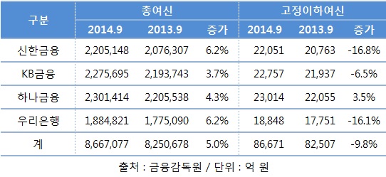 지난해 1~9월 4대 지주의 총여신은 866조7천억 원으로 전년 동기 825조 원보다 5% 증가했다. 반면 대출금 중 연체기간 3개월 이상의 부실채권을 뜻하는 고정이하여신은 15조9천억 원에서 14조3천400억 원으로 9.8% 감소했다.