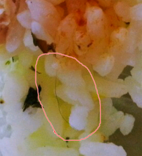 간편하게 끼니를 때울 요량으로 CU에서 스팸밥바를 구입했는데 중간쯤 먹었을 때 이물감이 느껴졌던 것. 먹다 남은 스팸밥바를 보니 밥 사이에 머리카락 한 올이 들어있었다.