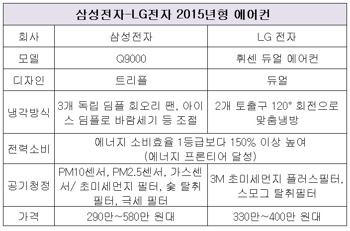 두 회사 모두 2015년형 에어컨이 에너지 소비효율 1등급 제품보다 150% 이상 효율을 높인 초절전 제품이라고 소개했다.