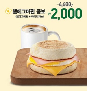 오는 19일부터 5일간 운영하는 콤보 메뉴는 아침메뉴 7종 중 햄에그머핀과 아메리카노로 구성되어 있고 오전 8시부터 오전 10시까지 2시간 동안 2천 원에 판매한다. 또 아메리카노는 900원에 할인 판매한다.