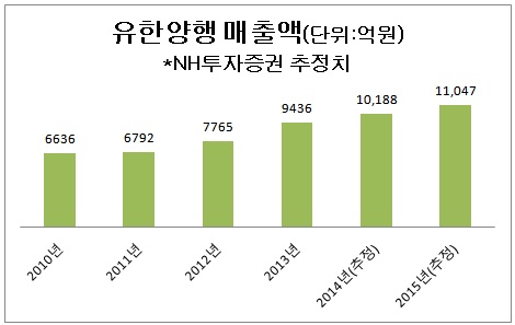 유한양행은 2010~2011년까지만 해도 매출액이 6천억 원대였지만 2012년 7천억 원, 2013년 9천억 원, 지난해에는 1조 원을 돌파하는 진기록을 세웠다. 영업이익도 지난해 620억 원에 이어 올해 1천억 원을 바라볼 정도로 성장세가 가파르다.
