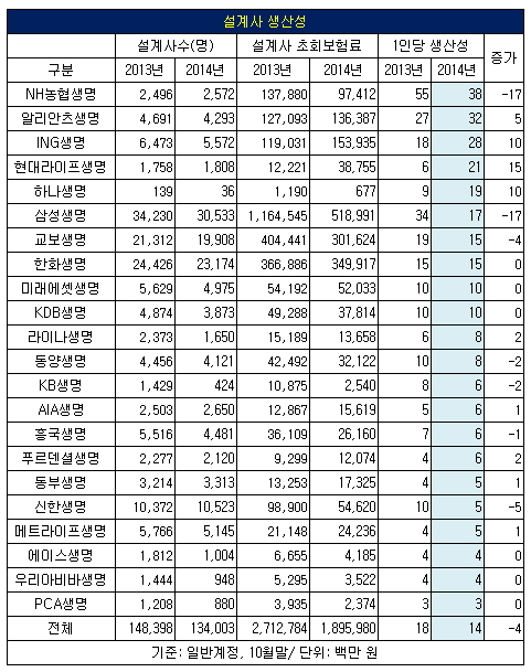 생보사 전체 1인당 평균 생산성은 내수경기 침체와 지난해 개인정보 유출 여파로 초회보험료가 크게 줄며 전년 대비 400만 원 가량 낮아졌다.