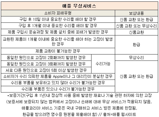 그동안 리퍼비시 정책을 운영해 왔던 애플은 1년간의 보증기간 중에 정상적인 사용으로 발생한 '재료나 기술 관련 고장에 의한 고장'에 대해 수리 또는 교체 서비스를 무상으로 제공하고 있다.