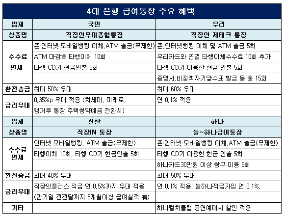 환전이나 송금환율 우대를 받고 싶다면 우리은행이, 적금 상품에 높은 금리 우대를 받고 싶다면 신한은행 급여통장을 이용하는 게 합리적이다. 문화공연을 즐긴다면 하나은행을 이용하는 것도 좋은 방법이다. 주요 은행 모두 뱅킹수수료나 ATM기기 출금 수수료 면제 등의 혜택은 공통적으로 운영중이다.