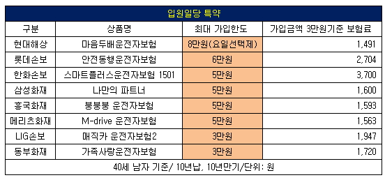 또 운전자의 직업, 나이, 사고 내역 등 위험률에 따라 보험사별로 가입한도가 3만 원에서 8만 원까지 제각각이어서 신중한 선택이 요구된다.
