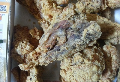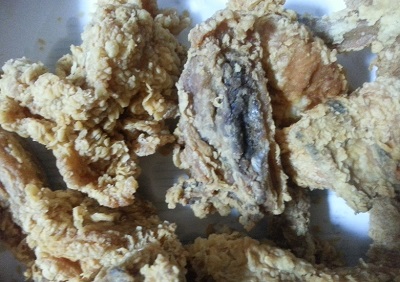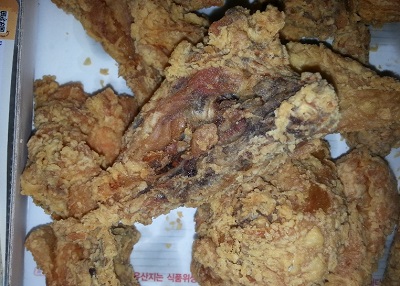 배달된 치킨 조각 중 일부가 곰팡이가 핀것처럼 거무스름한 빛을 띄고 있었던 것.
