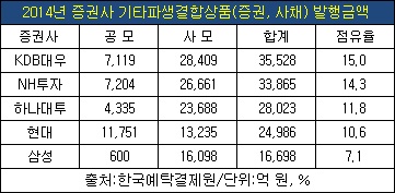 한편, 2014년 기타파생결합상품 발행금액 하나대투증권(대표 장승철)는 2조8천23억 원으로 11.8%, 현대증권(대표 윤경은)은 2조4천986억 원으로 10.6%, 삼성증권(대표 윤용암)은 1조6천698억 원으로 7.1%의 점유율을 나타냈다.