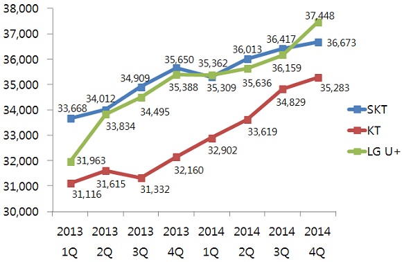 KT는 지난해 ARPU가 3만5천283원으로 통신3사 중 수익성이 가장 낮았지만 전년도(3만2천160원) 대비 9.7% 늘어나 SK텔레콤(2.9%), LG유플러스(5.8%)보다 월등히 높은 증가율을 보였다.