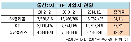 하지만 전년 대비 LTE 가입자 비중 증가 추세에서는 KT가 14.5% 포인트 상승해 LG유플러스(10%p), SK텔레콤(9.1%p)을 앞섰다.