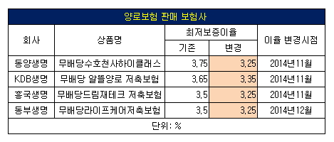 동부생명은 지난해 12월 무배당라이프케어저축보험의 최저보증이율을 3.5%에서 3.25%로 0.25%포인트 떨어트렸다.