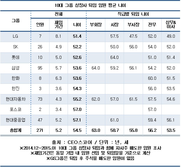 4일 기업 경영성과 평가사이트 CEO스코어(대표 박주근)가 10대 그룹 96개 상장사 임원 중 지난 연말 연초에 단행된 2015년도 정기인사에서 퇴임하고 자사주를 매도한 271명을 대상으로 조사한 결과 퇴임 임원의 평균 나이는 54.5세, 재임기간은 5.2년으로 나타났다.