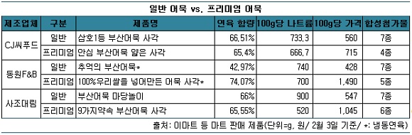 반면 나트륨 함량은 세 업체 모두 프리미엄급 어묵이 일반 어묵에 비해 낮은 것으로 확인됐다.