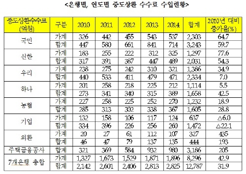 은행별로 보면 국민은행(행장 윤종규)이 최근 5년간 중도상환수수료 수입이 3천243억 원으로 1위를, 우리은행(행장 이광구)이 2천334억 원, 신한은행(행장 서진원)이 2천31억 원, 하나은행(직무대행 김병호)이 1천658억 원, 농협은행(행장 김주하)이 1천605억원, 기업은행(행장 권선주)이 1천472억 원, 외환은행(행장 김한조)이 444억 원 순이었다.