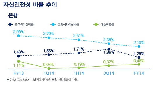 고정이하여신은 2013년 5조3천590억 원에서 4조220억 원으로 줄었고 이에 따라 고정이하여신비율도 2.81%에서 2.10%로 0.71%포인트 하락했다. 연체율도 1.14%에서 0.88%로 낮아졌다.