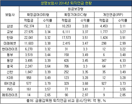 한편 삼성생명은 원금보장형 확정기여(DC)형 적립금 1조253억 원, 개인연금(IRP) 적립금 4천453억 원을 기록, 모두 1위를 차지했다 .