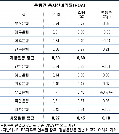 2013년의 경우 시중은행 평균 ROA는 0.27%로 지방은행(0.60%)의 절반 수준에도 미치지 못했다.