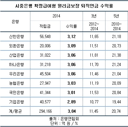 신한은행(행장 서진원)의 지난해 퇴직연금 운용 수익률 시중은행 중 가장 높은 것으로 나타났다. 퇴직연금 적립금 규모도 신한은행이 가장 컸다.