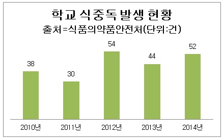23일 식품의약품안전처(처장 정승)에 따르면 지난해 학교급식 등으로 인한 식중독 발생건수는 52건으로 집계됐다. 2010년 38건에서 2011년 30건, 2012년 54건, 2013년 44건, 지난해 52건으로 발생건수가 증가하는 추세다.
