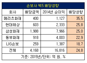 3일 금융감독원 전자공시시스템에 따르면 삼성화재를 비롯한 상위 5개 손보사의 2014년 잠정 당기순이익은 1조6천816억 원, 2015년 배당금 결정 총액은 4천168억 원으로 집계됐다. 이에 따른 현금배당 성향은 24.8%를 기록했다.