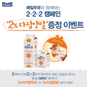2일 매일우유에 따르면 '2% 다짐양말 증정 이벤트'는 하루 2잔, 2% 저지방 우유를 마시는 '2-2-2 캠페인'에 참여하겠다는 내용의 댓글을 남기면 추첨을 통해 222명에게 '저지방&고칼슘 2%' 우유와 '2% 다짐양말'을 증정하는 이벤트다. 3월 2일부터 매일유업 페이스북과 카카오스토리를 통해 진행된다.
