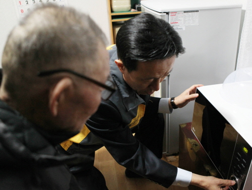 ▲김덕수 KB국민카드 사장이 직접 독거노인 가정을 방문, 전자레인지 설치를 돕고 있다.