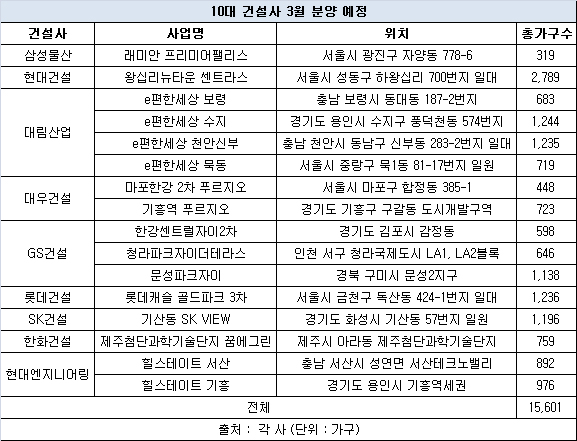 이 열기를 이어 3월에는 총 5만 세대 가까이 풀릴 것으로 예상된다. 10대 건설사 역시 총 16개 단지에 1만5천 세대가 넘는 물량을 준비하고 있다. 올해 공급 예정 물량(9만5천 세대)의 약 20%에 해당된다.