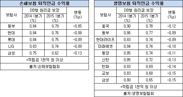 은행연합회와 금융투자협회, 생명보험협회, 손해보험협회 등에 따르면 확정급여형(DB) 원리금보장상품 적립금이 1천억 원 이상인 35개 금융사 모두 올해 1분기 수익률이 전년 동기에 비해 일제히 하락했다.