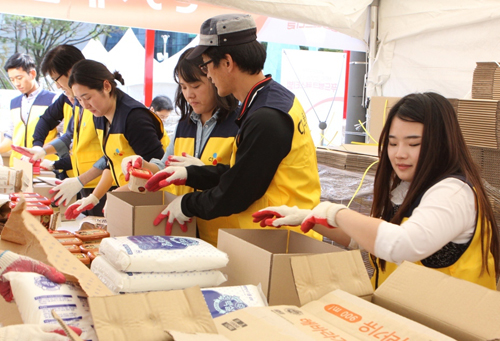 CJ제일제당(대표 김철하) 임직원들이 푸드뱅크에 기부할 생필품 선물세트를 조립하는 자원봉사에 나섰다. CJ제일제당은 지난 13일 서울 마포구에서 열린 푸드뱅크 식품나눔 페스티벌에 참가해 ‘2015 푸드뱅크 희망나눔 선물세트 조립봉사’를 실시했다.