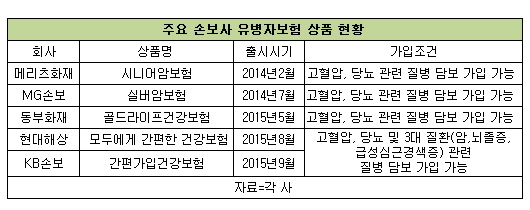 기존에 나온 상품들은 당뇨병이나 고혈압 등을 보장하는 형태였다. MG손보가 2014년 7월에 출시한 실버암보험(고혈압, 당뇨 유병자 가입가능), 메리츠화재(대표 김용범)가 2014년 2월에 출시한 시니어암보험(고혈압, 당뇨 유병자 가입가능) 등이 있다.