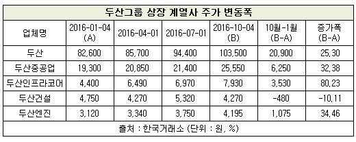 지주사인 두산(대표 박지원)은 실적이 크게 개선된 것이 주가에 영향을 미쳤다. 상반기 매출은 소폭 감소했지만 영업이익이 5천579억 원으로 전년 동기 대비 50.9% 증가했다. 두산중공업(대표 박지원), 두산인프라코어 등 자회사 실적이 개선된 것도 있지만 자체 사업이 호조를 띄었기 때문이다. 두산 주가는 10월 들어 주가가 10만 원을 돌파하는 등 올해 초에 비해 25% 이상 상승했다.