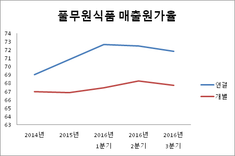 국내 사업 부문 원가를 나타내는 개별 기준 매출원가율을 살펴보면 2014년 67%에서 2016년 3분기 누적 기준 67.8%으로 0.8%포인트 상승하는데 그쳤다. 분기별로 살펴봐도 2분기를 제외하고는 67%대에 머물렀다.