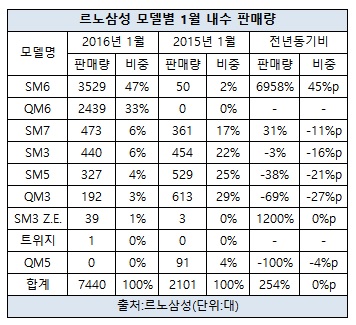 르노삼성 관계자는 “지난 1월 내수 판매는 SM6와 QM6가 이끌었다”며 “SM6는 3천529대, QM6는 2천439대, 총 5천968대가가 팔리며 전체 내수 판매량의 80% 이상을 차지했다”고 설명했다.