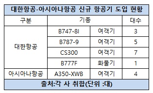 대한항공은 올해 여객기 15대와 화물기 1대 등 총 16대의 항공기를 신규 도입한다. 기종별로는 B747-8I 3대, B787-9 5대, CS300 7대를 도입한다. 화물기 'B787F'도 추가 도입한다.