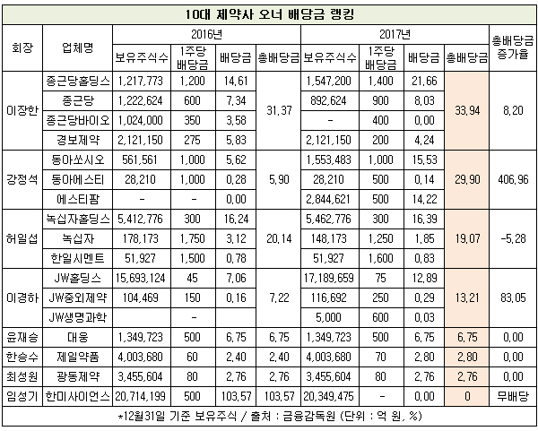 금융감독원에 따르면 지난해 매출 기준 상위 10개 제약사 오너 가운데 이장한 종근당 회장, 강정석 동아제약 회장, 허이섭 녹십자 회장, 이경하 JW중외제약 회장 등 4명이 올해 10억 원 이상을 배당 받는 것으로 나타났다.