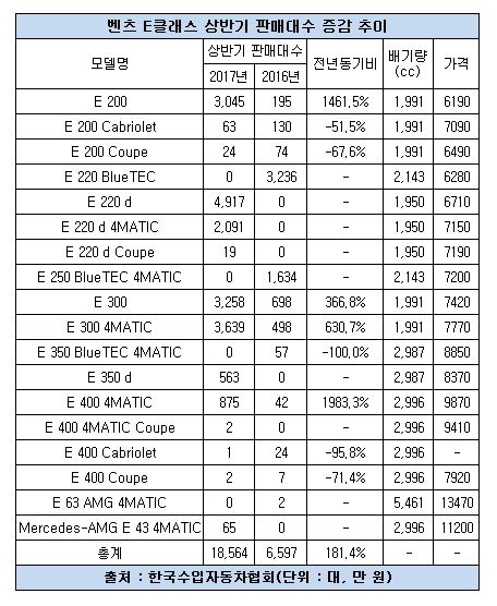 반면 지난해 6월 신 모델이 출시돼 '구형'이된 벤츠 E클래스는 전년 대비 181.4%의 놀라운 판매 성장을 이뤘다.