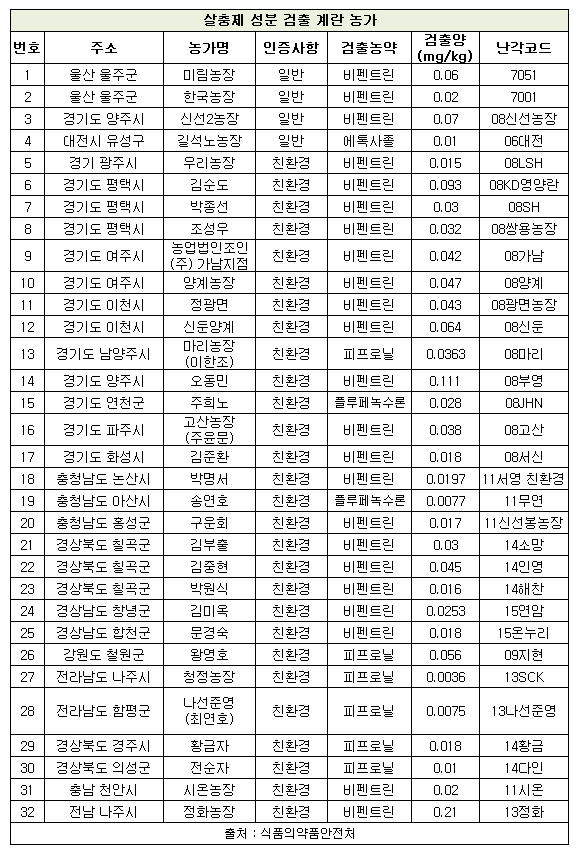 사용이 허가된 닭 진드기 제거용 살충제 비펜트린은 허용 기준치(0.01mg/kg)를 초과한 농장만 공개됐다. 비펜트린이 초과 검출된 농가는 22곳이다.