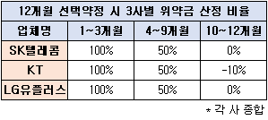 12개월 선택약정 시 위약금 산정 비율은 통신 3사 모두 1~3개월 100%, 4~9개월 50%로 동일하다. 10~12개월 구간에서 KT만 -10%로 쓸수록 추가 할인을 받는다.