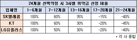 통신사별로 ▲SK텔레콤은 1~6개월 100%, 7~12개월 60%, 13~16개월 35%, 17~20개월 -15%, 21~24개월 -40%로 월 별 위약금 산정 비율을 규정하고 있다. ▲KT는 1~6개월 100%, 7~12개월 60%, 13~16개월 30%, 17~20개월 -20%, 21~24개월 -45% ▲LG유플러스는 1~6개월 100%, 7~12개월 50%, 13~16개월 30%, 17~20개월 -20%, 21~24개월 -40%다.