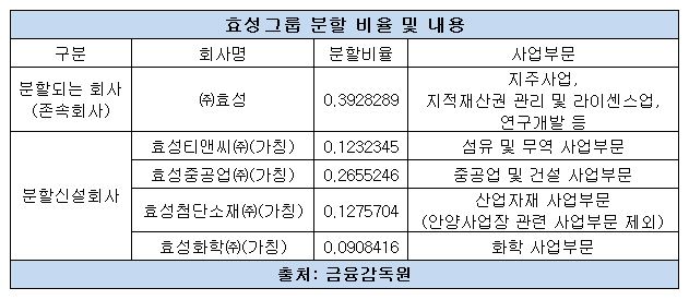 효성은 지난 3일 효성티앤씨㈜, 효성중공업㈜, 효성첨단소재㈜, 효성화학㈜ 등 4개 사업회사를 신설하고, 지주회사인 ㈜효성을 포함해 5개사로 회사를 분할한다고 밝혔다.